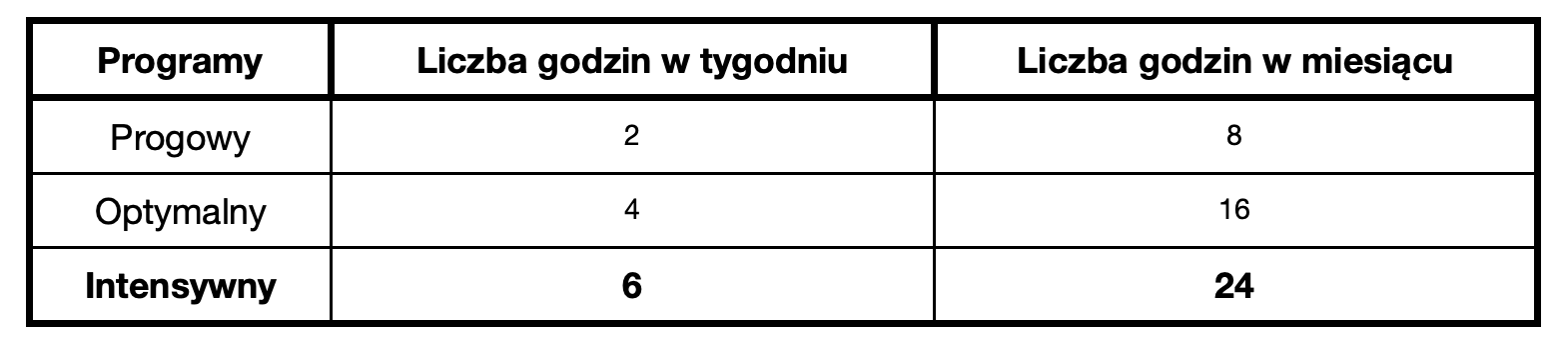 Alternatywą dla modelu intensywnego jest wariant zakładający 16 godzin miesięcznie na osobę (czyli 4 godziny tygodniowo). Taka forma umożliwia systematyczny rozwój kompetencji, eliminację błędnych nawyków i optymalizację czasu reakcji – choć nie zapewnia tak wysokiego tempa progresji, jak wariant intensywny. Może być jednak optymalnym wyborem w przypadku ograniczonej dostępności uczestników lub konieczności stopniowego wdrażania programu.